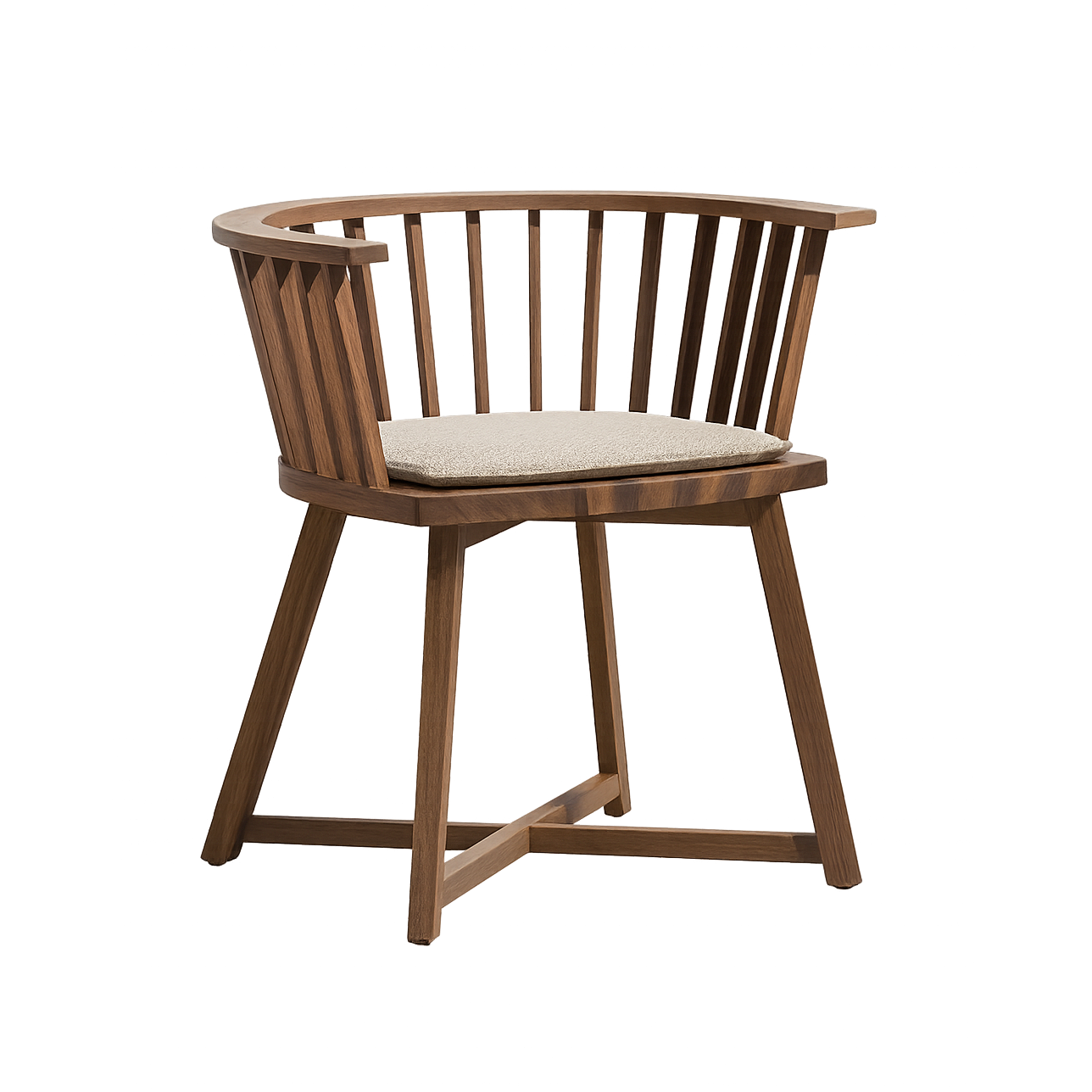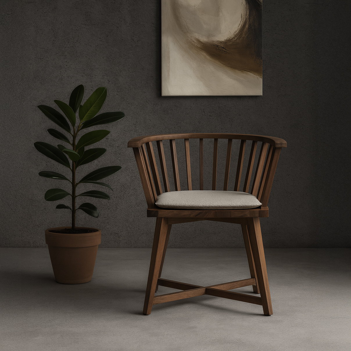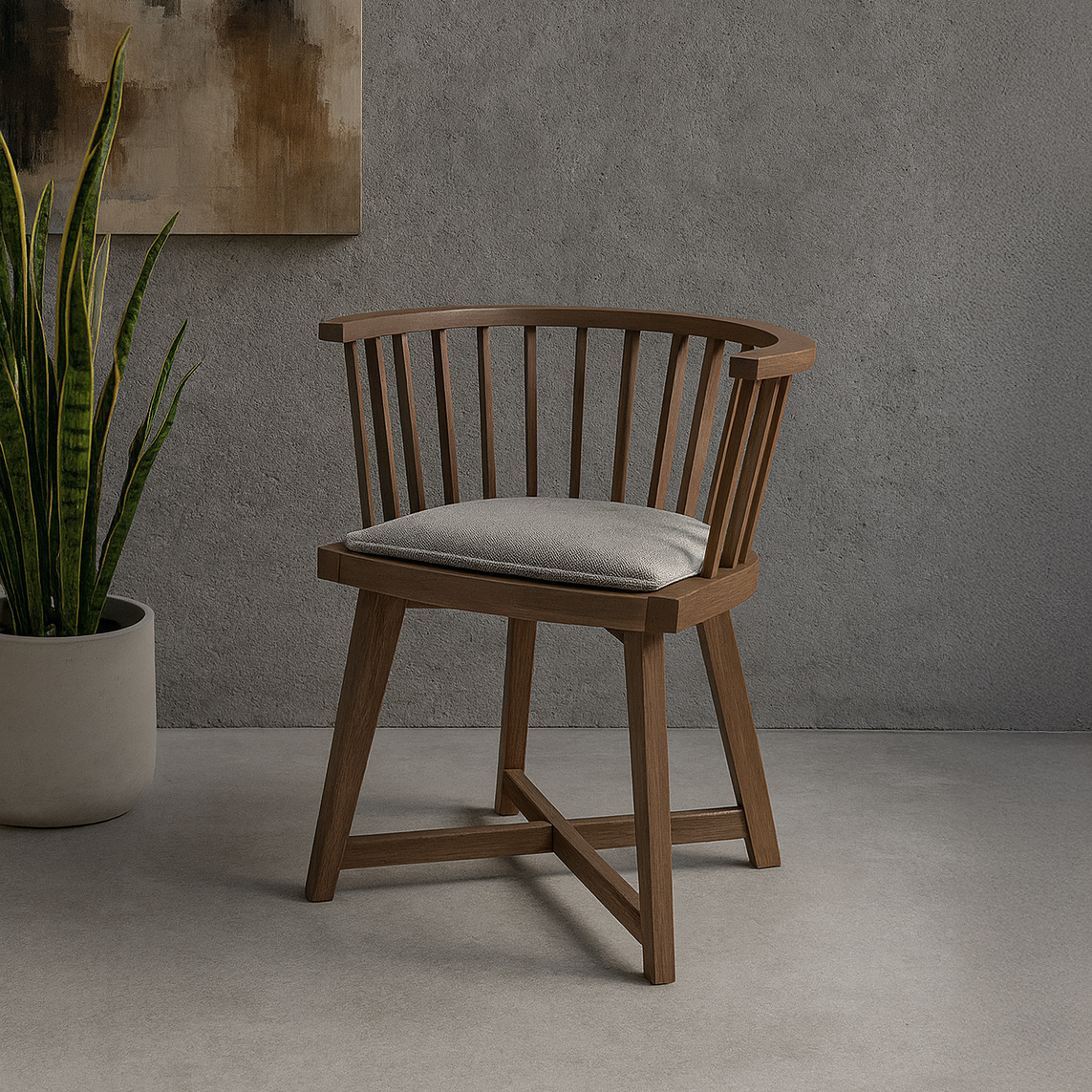 The Arundel Armchair is a study in refined proportion and sculptural clarity. Crafted in solid wood, its semi-circular spindle backrest and splayed legs strike a balance between tradition and modern minimalism. With its distinctive curved form and finely joined frame, Arundel offers both architectural presence and inviting comfort.
