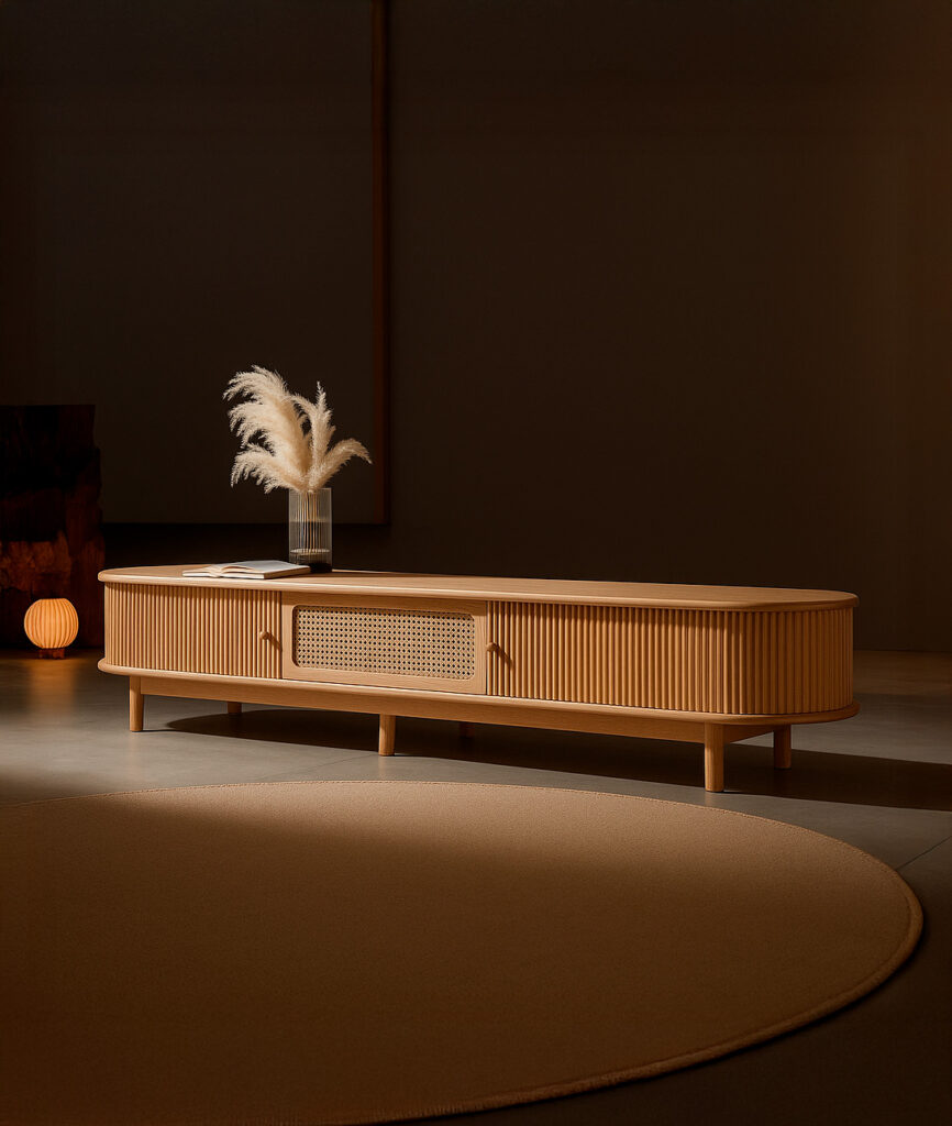 The Brunswick Low Sideboard embodies sculptural precision and quiet refinement, offering a contemporary interpretation of mid-century elegance. Its softly curved silhouette and rhythmic fluted detailing create a sense of movement and light play across the surface, while the craftsmanship celebrates the tactile beauty of natural timber. The addition of a woven rattan panel introduces organic texture and breathability, balancing the geometric symmetry of the design.