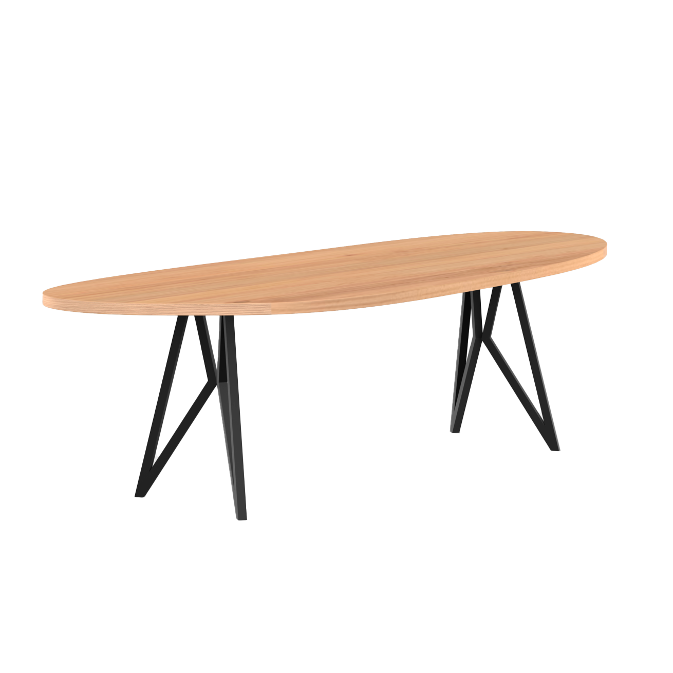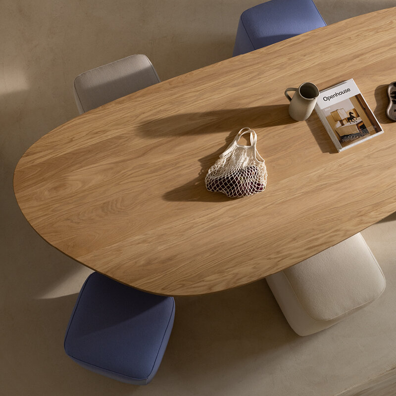 The Devonshire Table captures the essence of modern organic design — sculptural yet understated, refined yet inviting. With its elongated oval top and softly curved edges, it presents a balanced interplay between geometry and natural fluidity. The silhouette feels effortlessly contemporary, while the craftsmanship celebrates the warmth and tactile richness of solid oak. The table’s generous surface invites shared moments — from family gatherings to creative work — embodying a design language that values presence, calm, and authenticity.