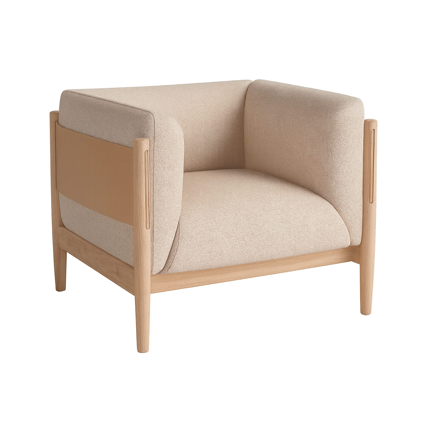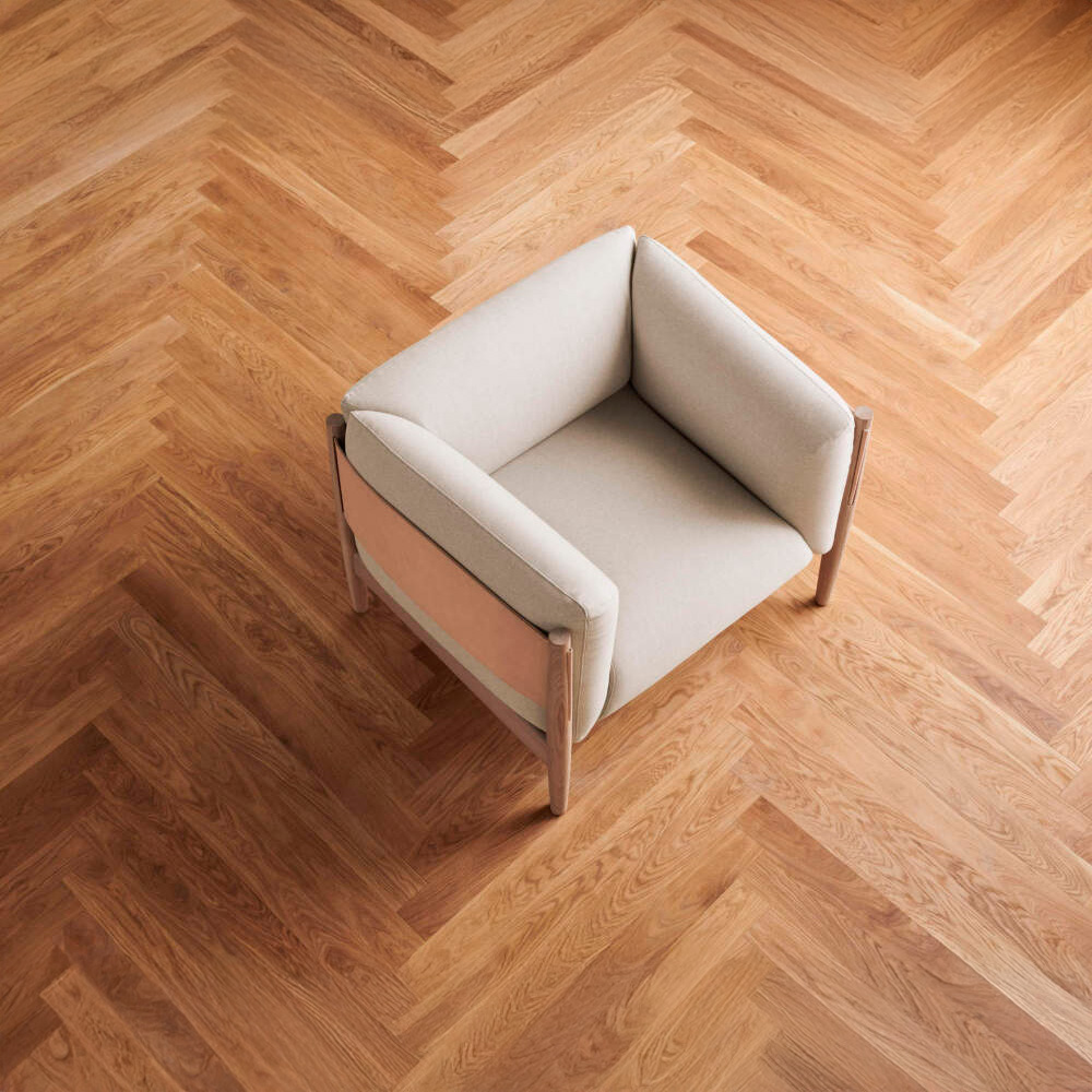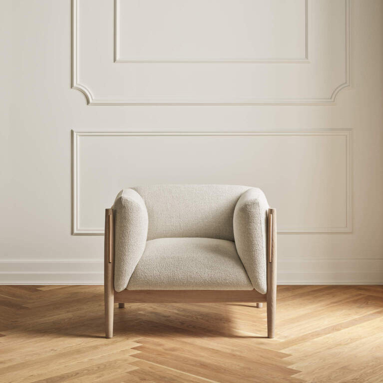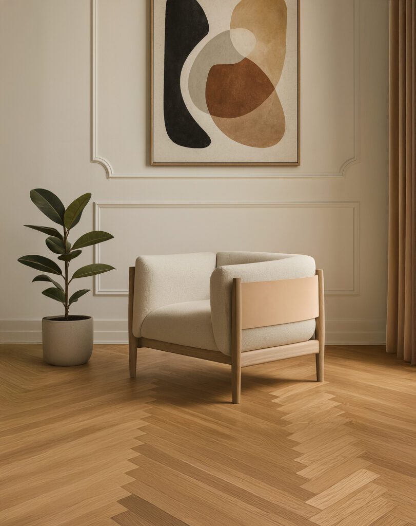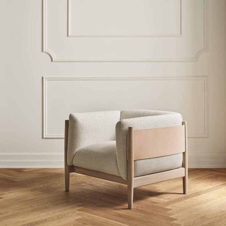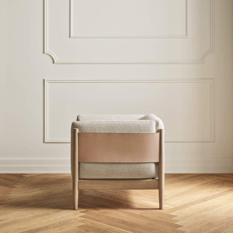 The Eltham Armchair embodies sculptural minimalism and quiet luxury through its interplay of geometry, material contrast, and meticulous craftsmanship. Its defining form—composed of softened lines, precise joinery, and a low, grounded stance—reflects an architectural sensibility while maintaining a sense of calm and comfort. The oak frame supports an upholstered seat and backrest that seem to float within the structure, balanced by a supple leather panel that gently wraps around the rear for both aesthetic and tactile warmth.