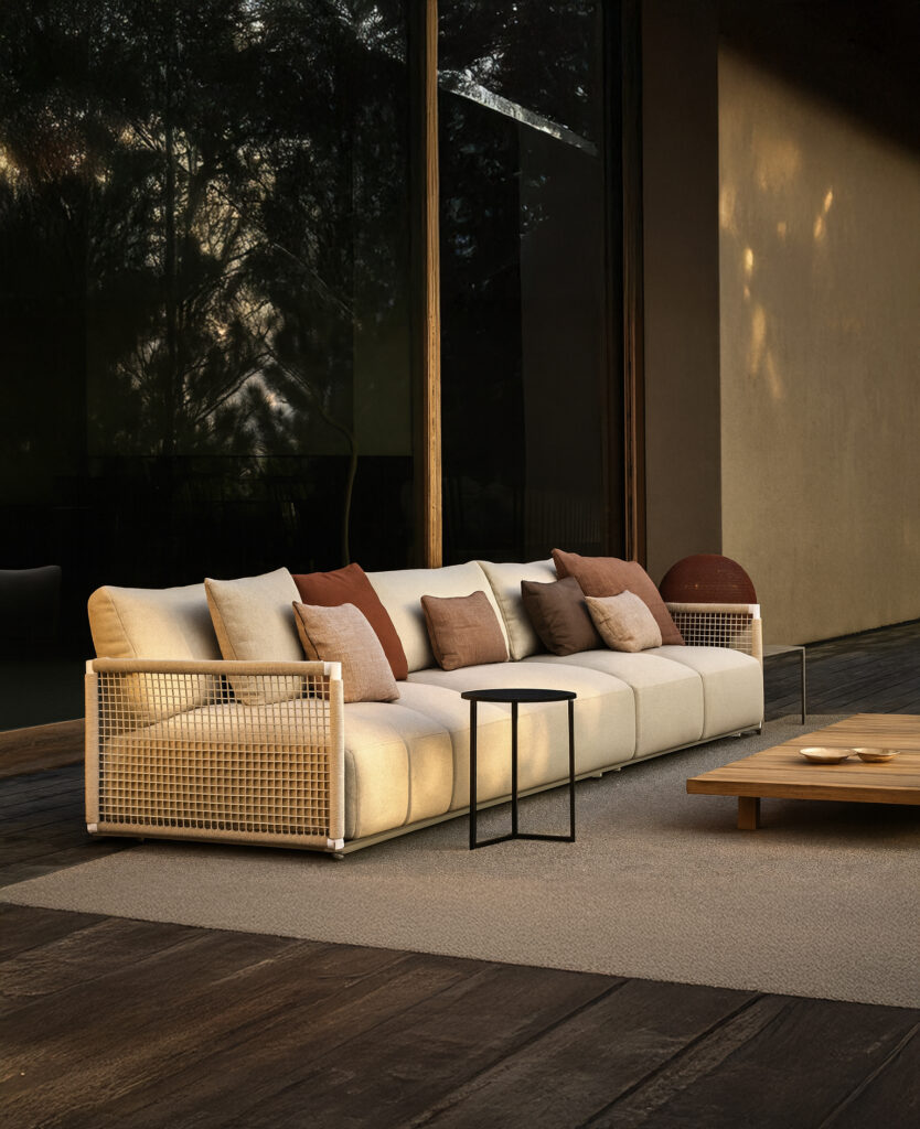 The Highclere Sofa redefines outdoor living with its bold geometry and inviting comfort. Its modular silhouette is grounded by woven side panels and a low, architectural base that gives presence without heaviness. The generous cushions are relaxed yet refined, creating a seating experience that feels indulgent but remains practical for outdoor use.