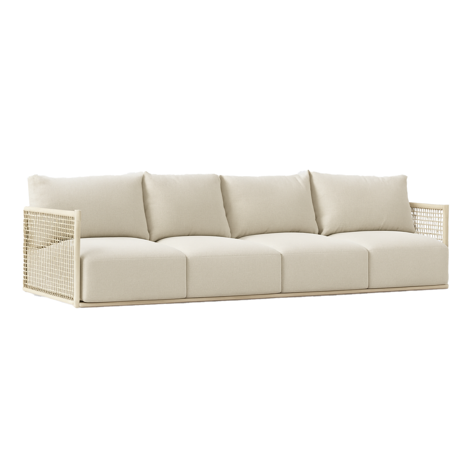 The Highclere Sofa redefines outdoor living with its bold geometry and inviting comfort. Its modular silhouette is grounded by woven side panels and a low, architectural base that gives presence without heaviness. The generous cushions are relaxed yet refined, creating a seating experience that feels indulgent but remains practical for outdoor use.
