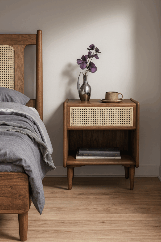 Functional and sculptural, the Savoy Bedside Table provides a discreet drawer for essentials and an open shelf for books or display. The blend of oak or walnut and cane detailing ensures visual harmony and tactile appeal.