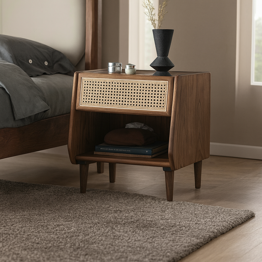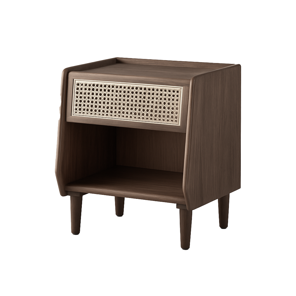 Functional and sculptural, the Savoy Bedside Table provides a discreet drawer for essentials and an open shelf for books or display. The blend of oak or walnut and cane detailing ensures visual harmony and tactile appeal.