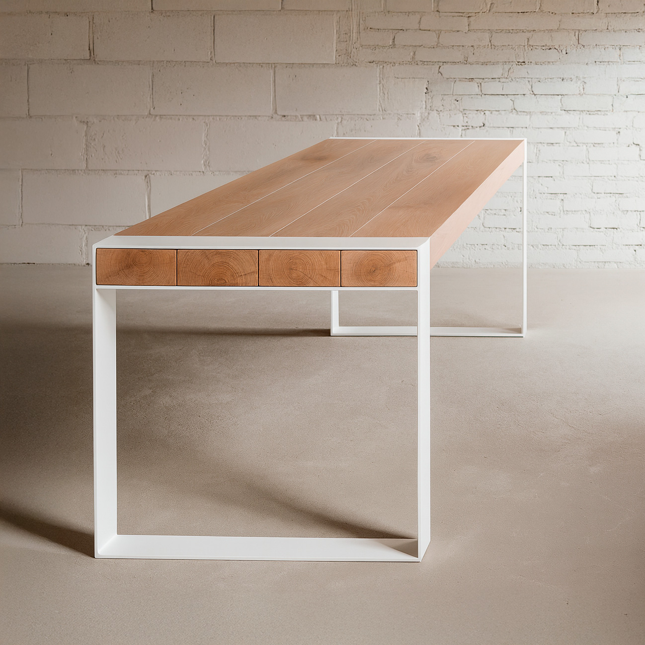 Crafted with precision, the table’s edges align seamlessly within the powder-coated frame, giving the impression that the wooden surface floats lightly within its structure. The solid oak top is treated with a matte finish that enhances its tactile quality while ensuring durability against daily use. From modern apartments to open studio spaces, Whitmore commands attention as a versatile centerpiece — equally refined as a dining table or a creative workspace.