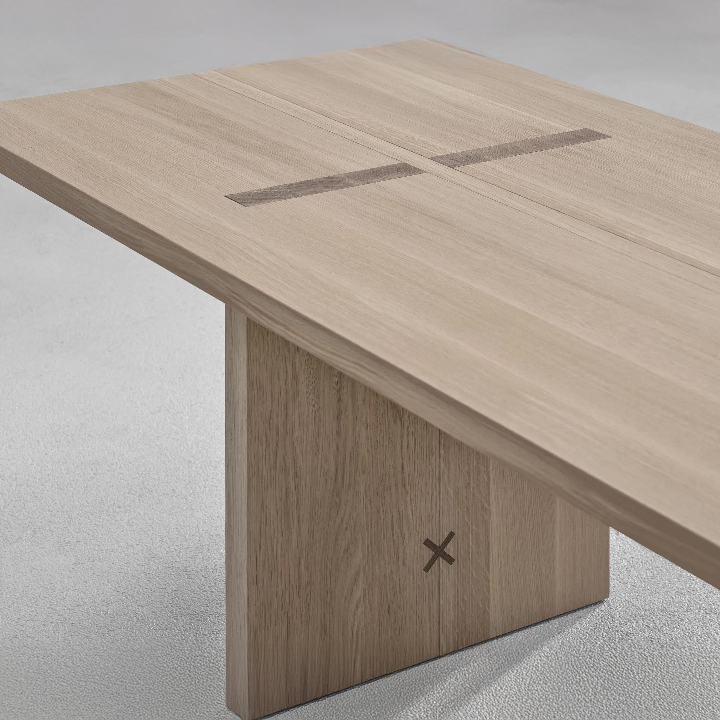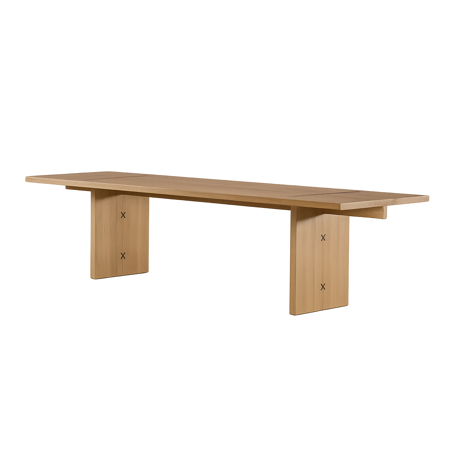 The Woburn Table embodies architectural strength and understated refinement. Its expansive solid oak top is supported by two broad plank legs, joined with subtle cross-detailing that reveals the craftsmanship behind its construction. With its monolithic proportions and clean geometry, Woburn makes a powerful statement in both dining and meeting spaces.